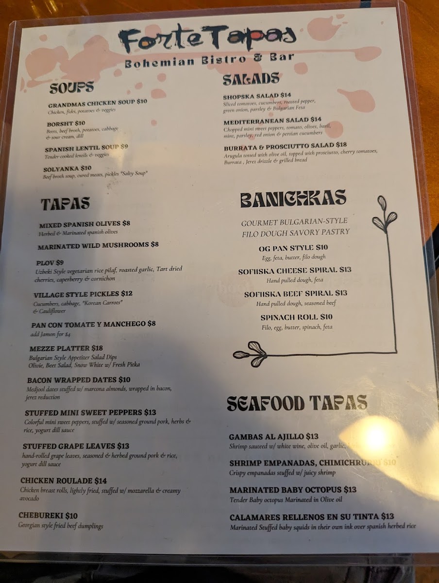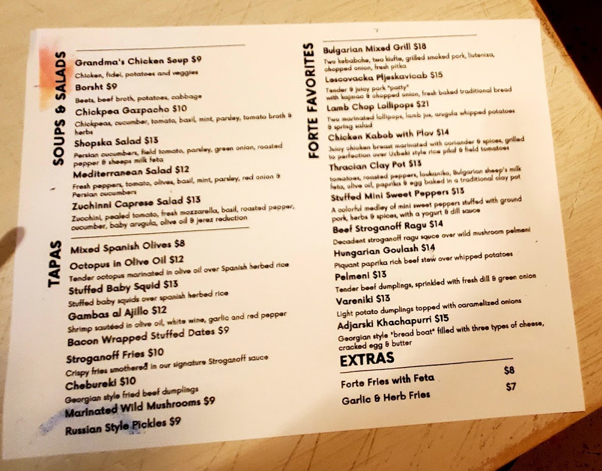 Welcome to Forte Tapas, a culinary gem nestled in Las Vegas, where European flavors beautifully collide. Their menu offers a vibrant array of dishes, combining Mediterranean freshness with Eastern European charm. Start your journey with a refreshing Mediterranean Salad or a hearty Borscht, featuring the perfect blend of beets and tender vegetables. For sides, indulge in Kebabche or Whipped Potatoes that complement any entrée wonderfully.